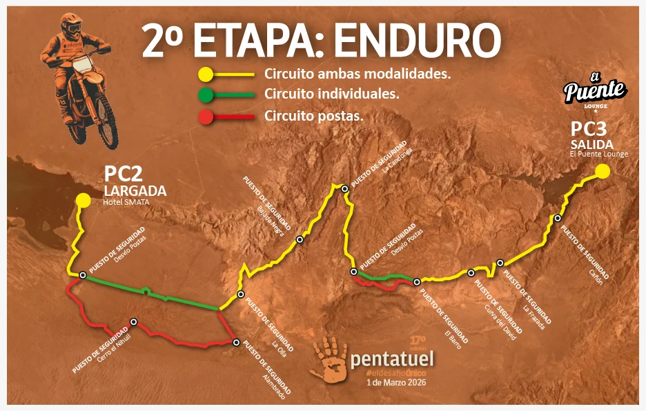 En el trazado de moto habrá puestos de control fijos (Controles de Paso), que tomarán el número de las motos que pasan. El NO registro de algún control, indica el no paso por el puesto fijado, implicando la descalificación o recargo para el corredor (A DECIDIR POR LA ORGANIZACIÓN LA SANCIÓN IMPUESTA). El recorrido es de variada dificultad. No está permitido el cambio de moto y NO esta permitida la ayuda externa, solamente se permitirá en el momento de la recarga de combustible y en el momento de inflar las cubiertas y solo en los puestos indicados por la organización. El competidor SI puede ser ayudado por otro participante inclusive ser remolcado.