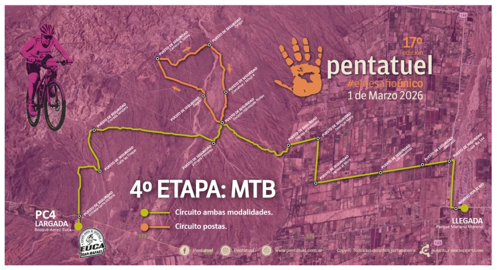 - Está permitido el cambio de Rueda (llanta),y solamente en el PC que disponga la organización, pero no estará permitida la ayuda externa para las reparaciones de la bicicleta (cambio de rueda, pinchadura, corte de cadena, etc.) Deberá recorrer el circuito marcado por cintas y se podrá distanciar como máximo 1 metro hacia ambos lados del mismo. El recorrido será en variedad de terrenos.